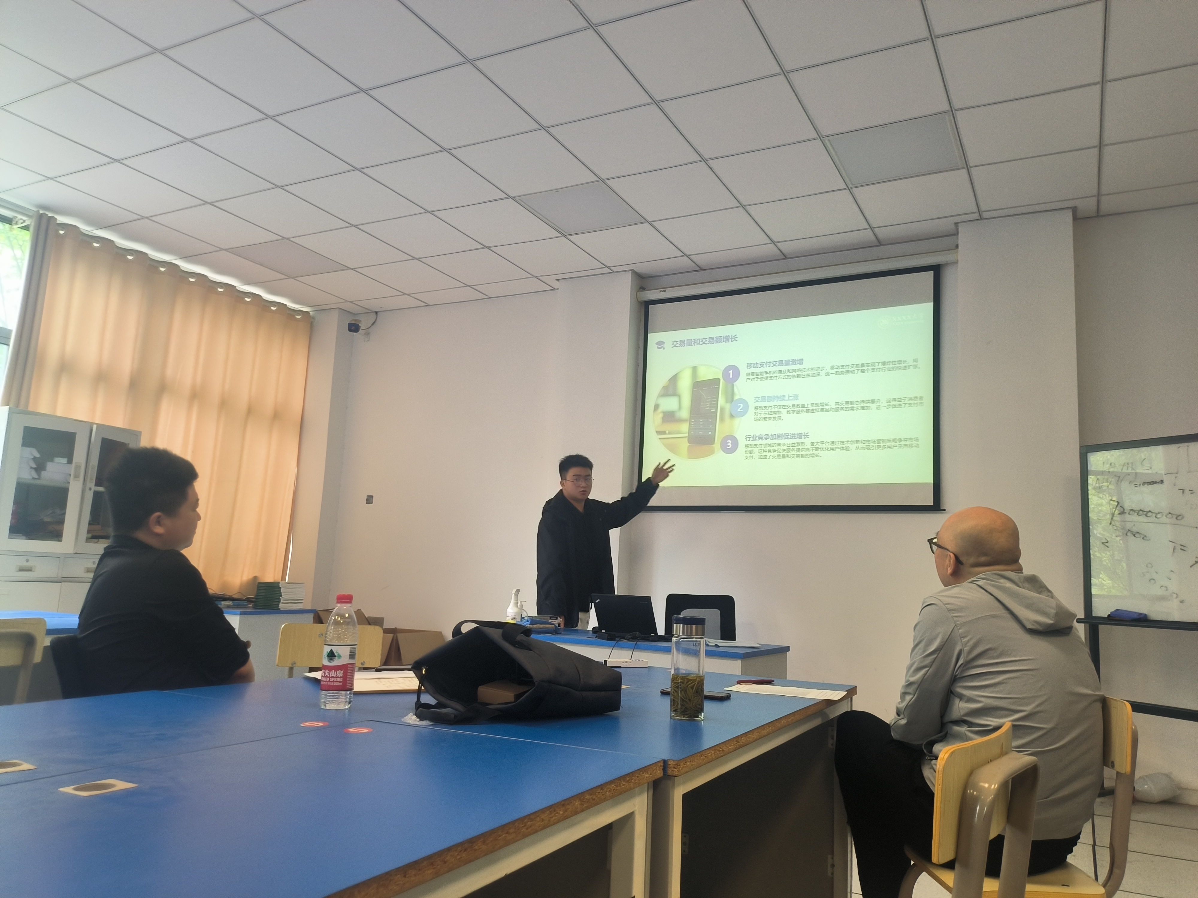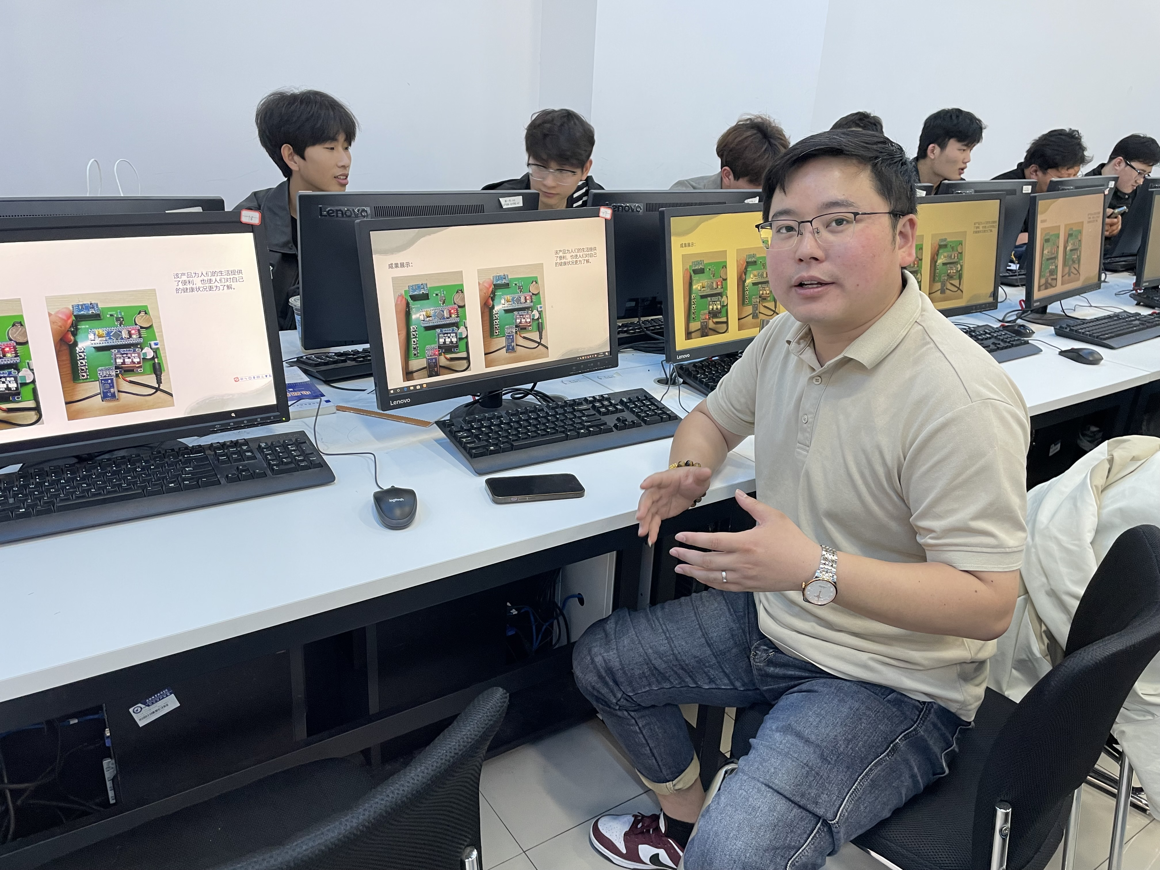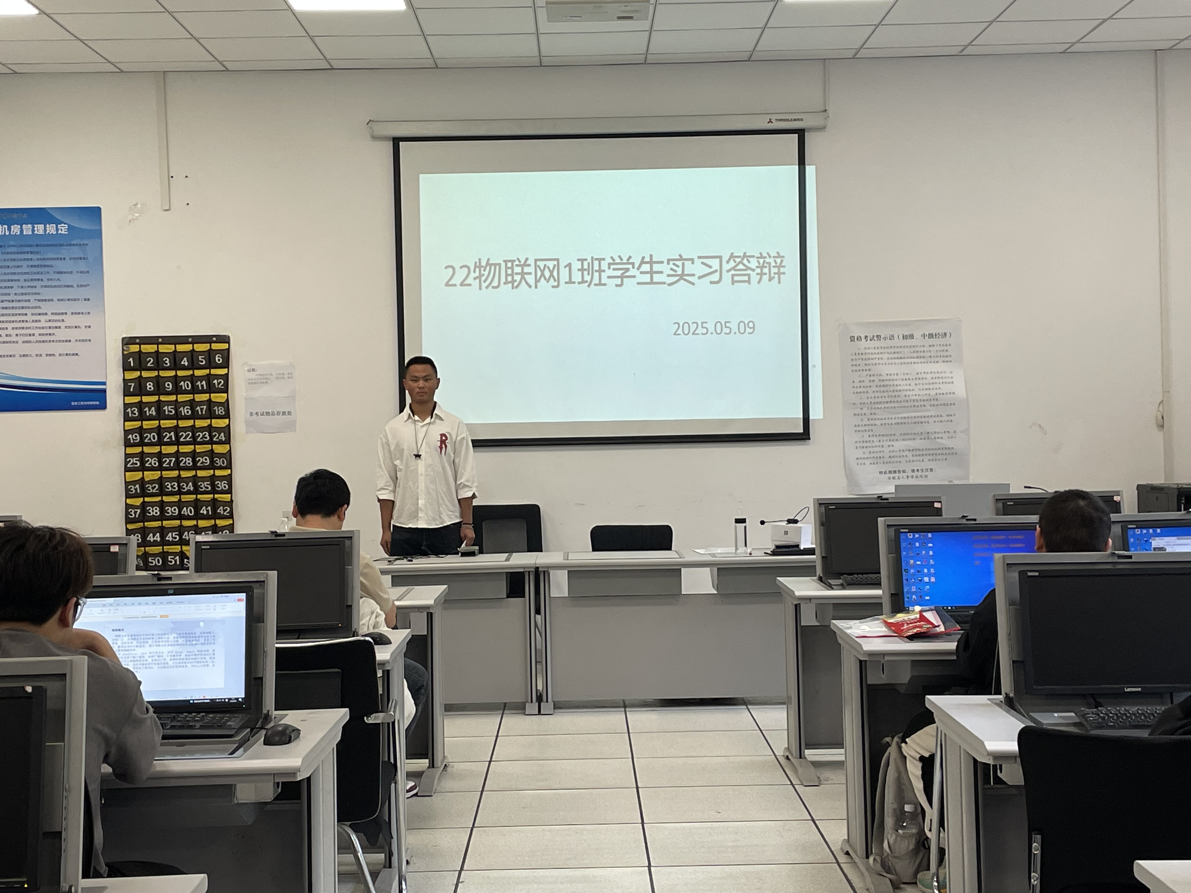 22物联网1班的答辩在信息楼B201举行,实习指导老师丁小一老师和行业导师王积彭担任评委;23物联网转段班的答辩在信息楼B203举行,实习指导老师童友波老师和行业导师马达担任评委。答辩现场,学生们依次通过 PPT 展示、口头汇报等形式,详细阐述了实习岗位、工作内容、遇到的问题及解决方案、个人在实习中的成长与感悟,以及毕业设计成果展示。